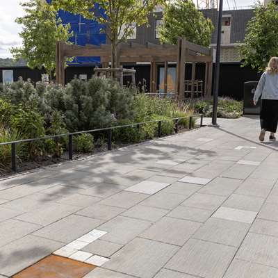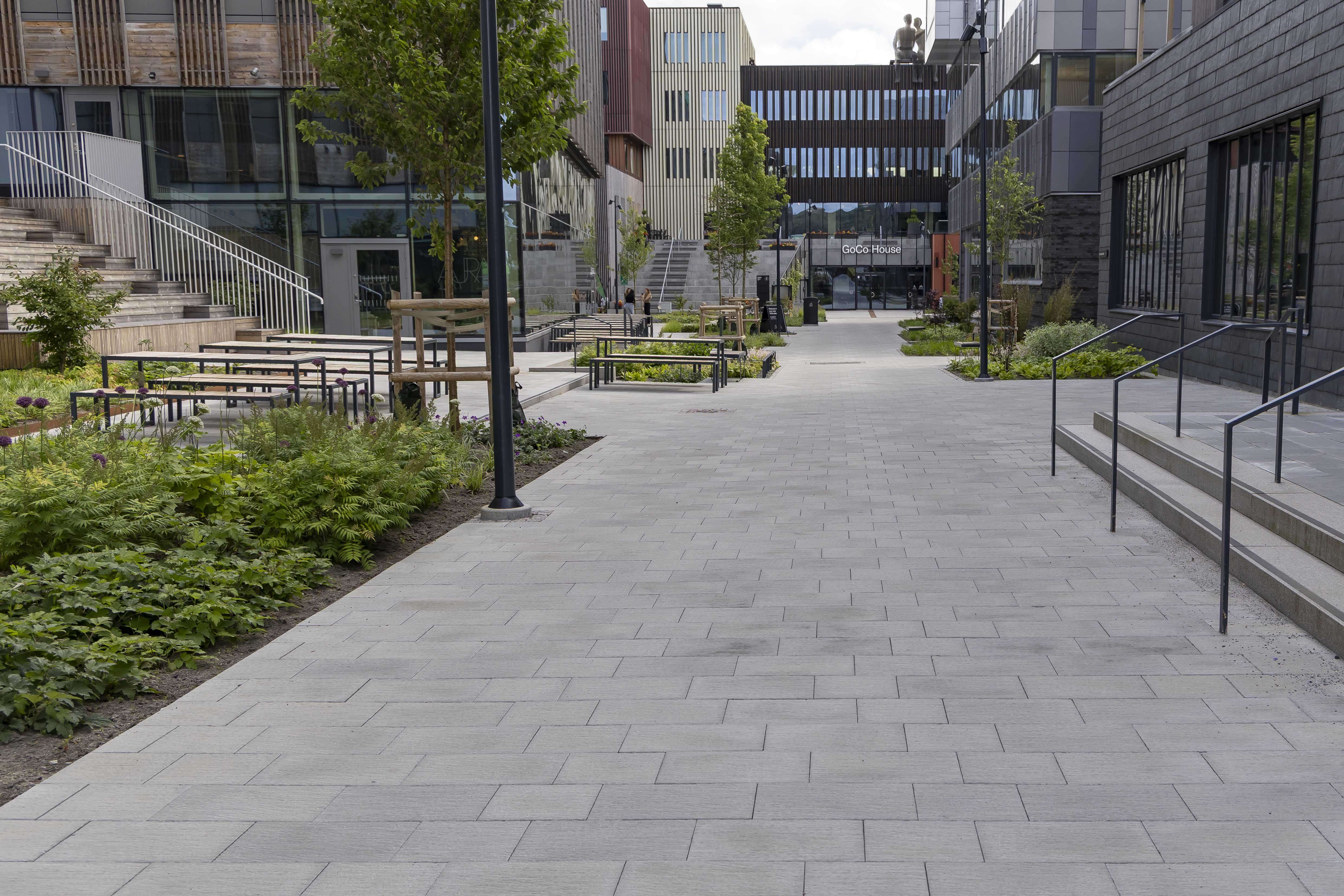 Till markytor utanför GoCo House har Benders levererat Bender City Borstad, en serie plattor som är 100 mm tjocka och speciellt utvecklade för stadsmiljöer med höga belastningar och stora påfrestningar.