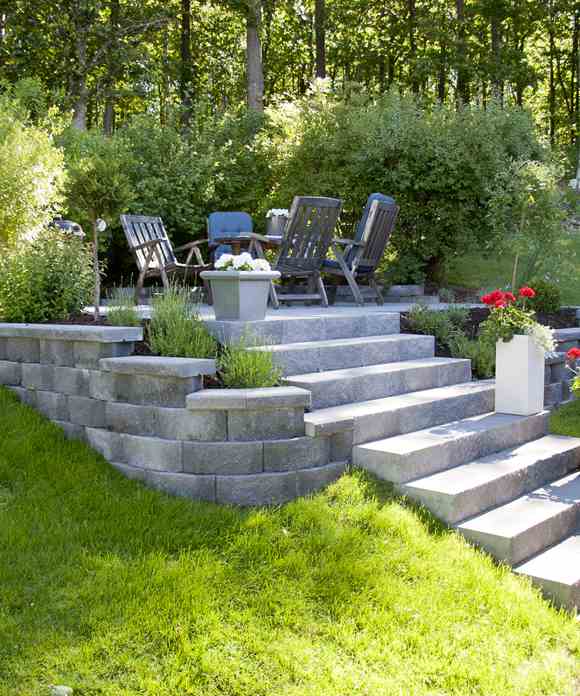 • Trädgård med murar, trappa, trädgårdsgång och dekormaterial.