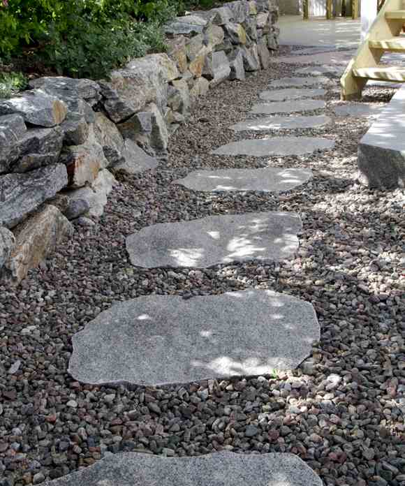 • Trädgård med murar, trappa, trädgårdsgång och dekormaterial.