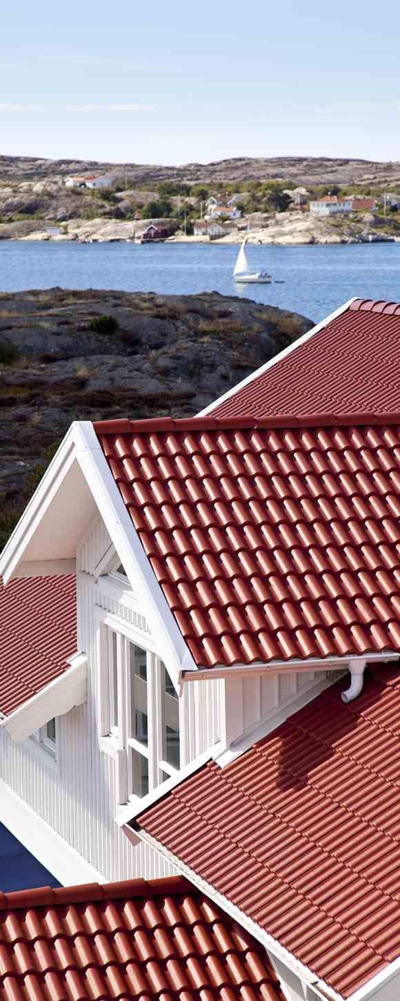 • Ett vitt hus med Benders takpannor på.